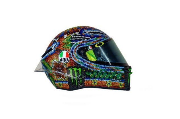 “L’arte huichol mi ha incuriosito fin da subito, perchè riprende molti dei miei simboli, come il sole e la luna o la tartaruga” spiega Valentino Rossi. “Abbiamo cercato di ricreare sul casco l’effetto delle perline con cui i messicani danno colore e forma a questi oggetti, ma di farlo in chiave Valentino Rossi”.