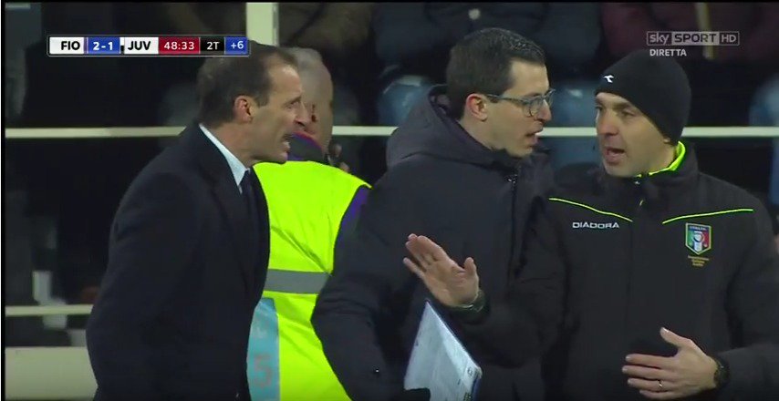 L’allenatore livornese della Juventus è stato ripreso dalle telecamere in diretta subito dopo la fine di Fiorentina-Juventus 2-1. Il video mostra un acceso diverbio nei confronti dell’assistente di Banti, il quarto uomo Di Liberatore. Allegri avrebbe gridato “Testa di c***o!” a Di Liberatore prima di allontanarsi dalla propria panchina e far rientro negli spogliatoi.